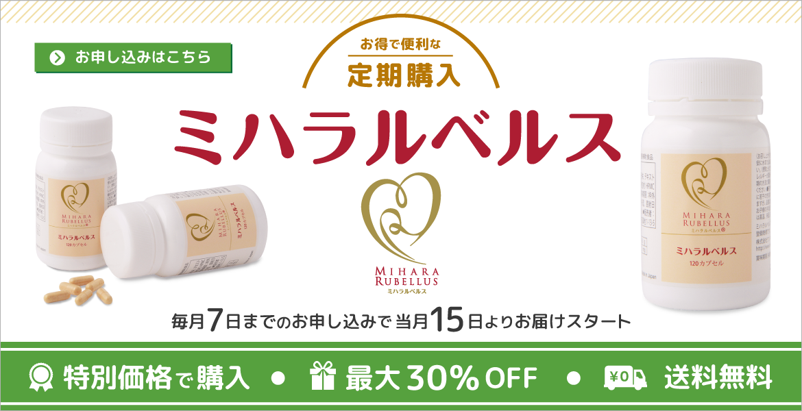 ミハラルベルスショップサイトは、定期購入システムをご用意いたしました。毎月決まった日にミハラルベルスをお届けします。続けてこそのミハラルベルス!末永くご愛飲いただくことで期待におこたえいたします。